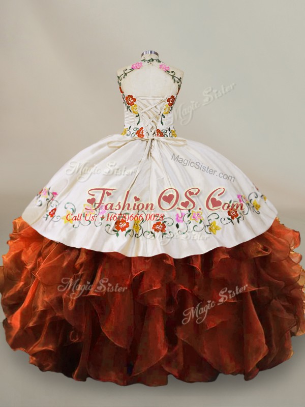 Rust Red Lace Up Halter Top Embroidery and Ruffles Ball Gown Prom Dress Organza Sleeveless
