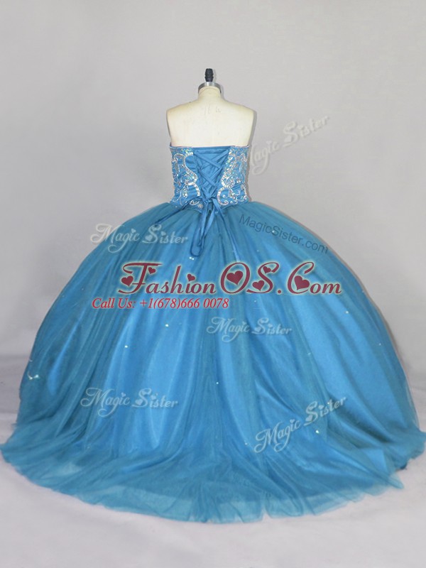 Sleeveless Tulle Brush Train Lace Up Quinceanera Dresses in Blue with Beading