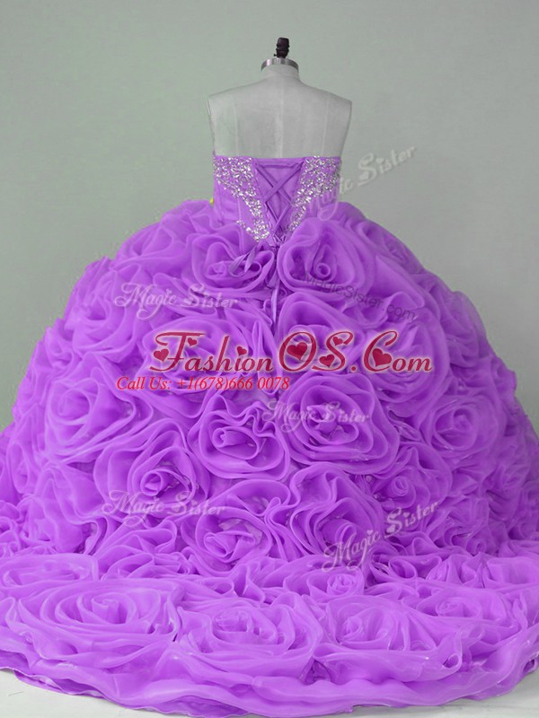 High Quality Lavender Lace Up Quince Ball Gowns Beading Sleeveless Brush Train