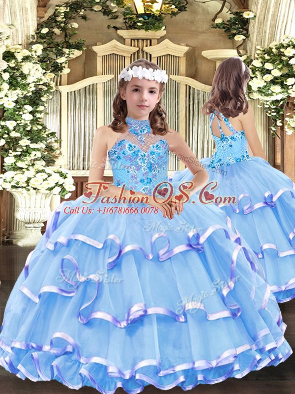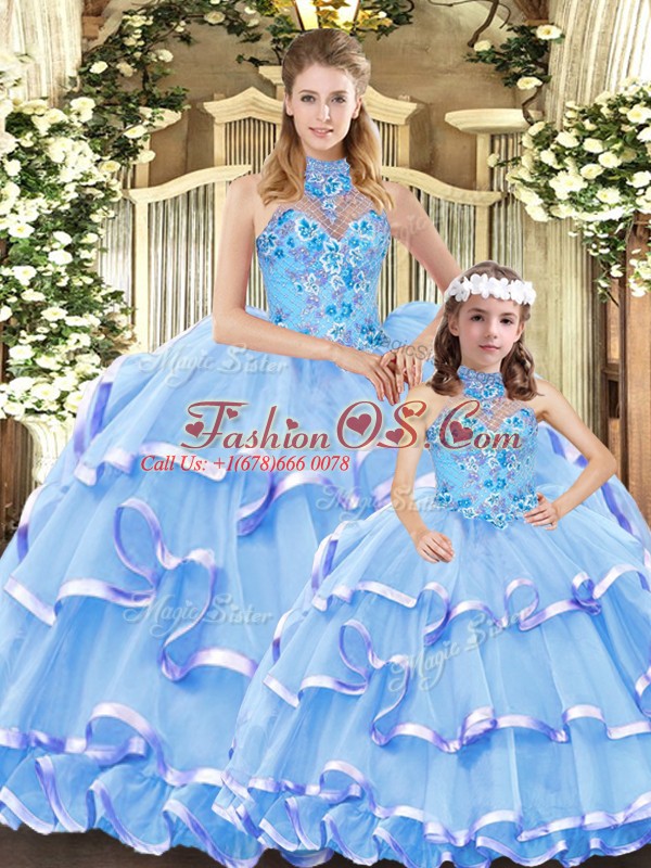 Deluxe Blue Sleeveless Embroidery and Ruffled Layers Lace Up Quinceanera Gowns