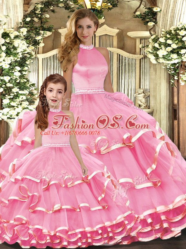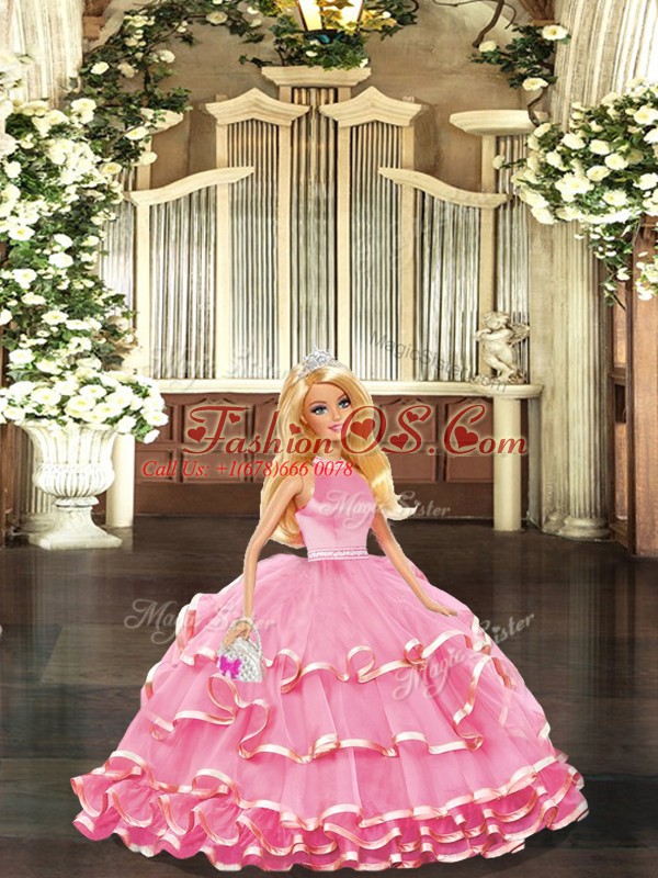 Shining Floor Length Pink Quinceanera Gown Organza Sleeveless Beading and Ruffled Layers
