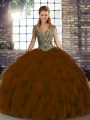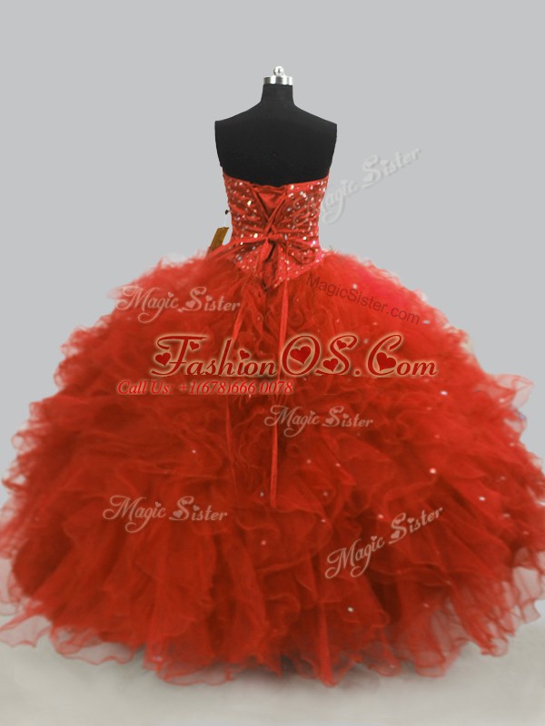 High Class Rust Red Tulle Lace Up Sweetheart Sleeveless Floor Length Ball Gown Prom Dress Beading and Ruffles