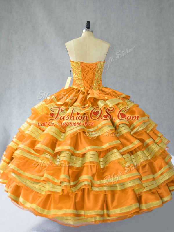 Captivating Gold Ball Gowns Organza Sweetheart Sleeveless Embroidery and Ruffled Layers Floor Length Lace Up Sweet 16 Dress