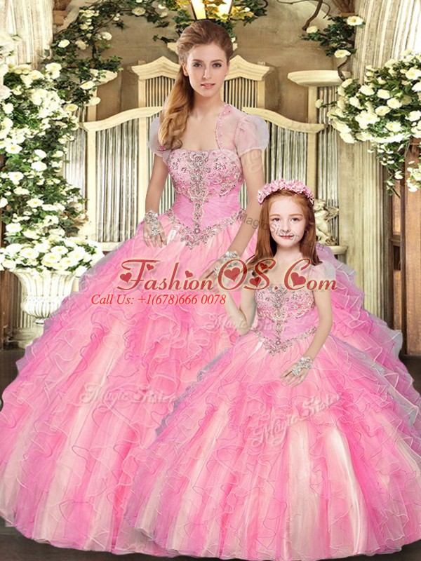 Hot Sale Baby Pink Strapless Lace Up Beading and Ruffles Quinceanera Gown Sleeveless