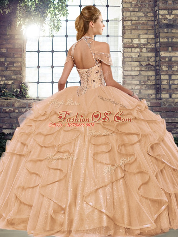 Discount Halter Top Sleeveless Sweet 16 Quinceanera Dress Floor Length Beading and Ruffles Fuchsia Tulle