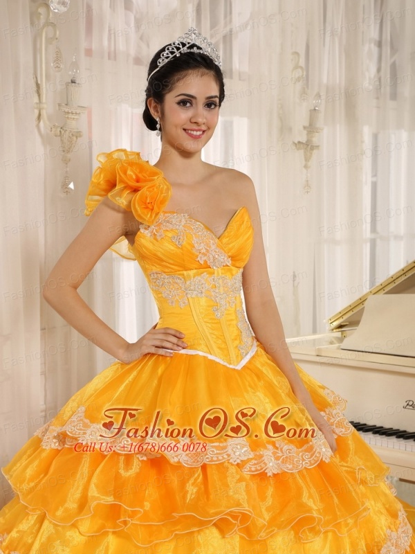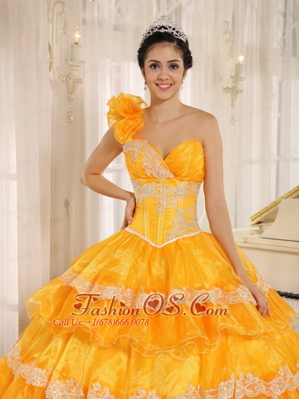 So gorgeous ball gown dress includes design of one shoulder adorned with flowers which is generally considered more provocative than other style. You can find that refined applique decorate the whole bodice which looks charming. The coset back will make you looks sexy. Dressing this ball gown, you will light up the night. Throughout the full maxi dress with many tiers hemmed with floral lace, the elegant and poised temperature is displayed entirely. What’s more, no matter what color you chose, the amazing effect won’t lose. The organza makes you feel soft and smooth.